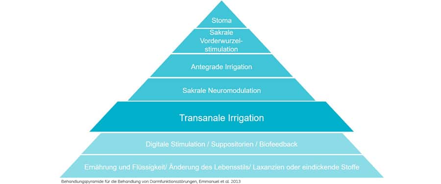 Im Jahr 2013 wurde ein internationaler Konsensreview durchgeführt, der von 12 medizinischen Spezialisten aus einer Reihe von Disziplinen mit Erfahrung in der Verschreibung und Überwachung von Patienten mit Transanaler Irrigation durchgeführt wurde. Es wurde eine Behandlungspyramide für die Behandlung von Darmfunktionsstörungen bei Erwachsenen zusammengestellt.2 Die Überprüfung definiert die Transanale Irrigation als die nächste Behandlungsoption nach First-line-Behandlung, wie Ernährung und Abführmittel.