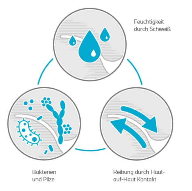 Als 3-in-1-Lösung für ein erfolgreiches Hautfaltenmanagement hat sich InterDry bewährt. Der weiche Textilstoff wirkt auf die drei Hauptursachen der Intertrigo ein: Er minimiert die Reibung von Haut-auf-Haut, bekämpft Bakterien mit antimikrobiellem Silberkomplex und transportiert Feuchtigkeit aus der Hautfalte heraus, sodass sie verdunsten kann.