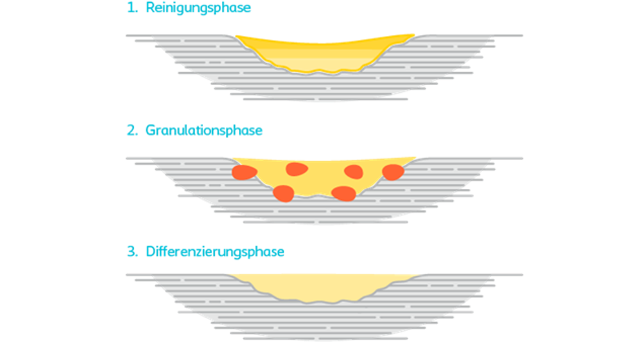 Bei der Wundheilung lassen sich verschiedene Phasen unterscheiden: Die Reinigungsphase, die Granulationsphase und die Differenzierungsphase. Dabei laufen diese nicht immer sequenziell, sondern häufig auch parallel ab. In der Reinigungsphase versucht der Körper die Wunde zu säubern. Sie setzt im Moment der Verletzung ein und dauert ca. 3 Tage. Etwa am 4. Tag beginnt die Granulationsphase, in der Zellen gebildet werden, die die Wunde mit dem Gewebe verschließen. In der letzten Phase, der Differenzierungsphase, beginnt die Ausreifung der kollagenen Fasern, wodurch die Wunde kleiner wird und sich langsam Narbengewebe bildet. Bei chronischen Wunden können die Phasen stagnieren, deswegen sollte die Wundversorgung immer phasengerecht durchgeführt werden.